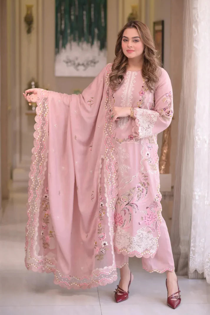 Striking Elegance: Rich heavy embroidery on the shirt paired with the textured slub net dupatta and plain trouser creates a stunning, festive-ready look ideal for summer gatherings and special occasions.